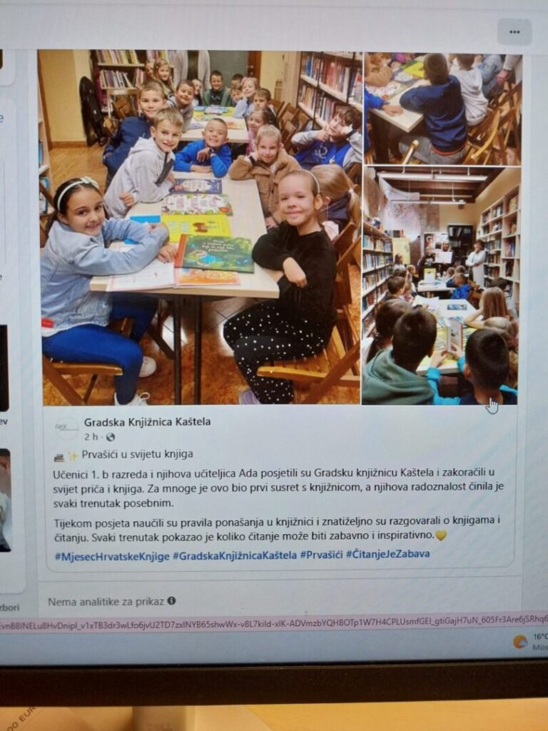 Učenici 1.b razreda i njihova učiteljica Ada su jučer posjetili Gradsku knjižnicu Kaštela i zakoračili u svijet priča i knjiga. Za većinu je ovo bio prvi susret s knjižnicom, a njihova radoznalost činila je svaki trenutak posebnim. Tijekom današnjeg dana su učenici 1.a i 1. c sa učiteljicama Darijom Abramović i Rankom Tomaš također posjetili Gradsku knjižnicu u prostorijama dvorca Vitturi. Učenici su tijekom posjeta razgledali što sve jedna knjižnica ima. Razgovarali su o knjigama i čitanju, naučili su pravila ponašanja u knjižnici, a svaki trenutak pokazao je koliko čitanje može biti inspirativno.