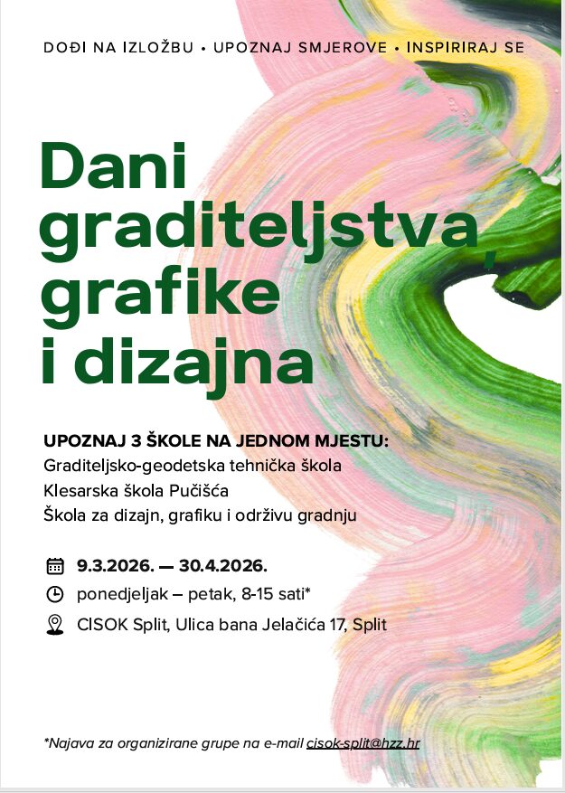Poziv učenicima, osobito osmašima, da od ponedjeljka 9.3. do 30.4.2026. u CISOK-u Split, Ulica bana Jelačića 17, posjete zajedničku izložbu učeničkih radova tri srednje škole iz područja graditeljstva, grafike i dizajna: Graditeljsko-geodetske tehničke škole, Škole za dizajn, grafiku i održivu gradnju i Klesarske škole Pučišća. Ovo je jedinstvena prilika da se učenici, osobito osmaši, upoznaju sa zanimanjima i obrazovnim programima iz ovih obrazovnih sektora.
